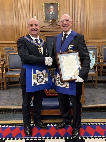 Gary reported “I had the honour of visiting Motherland Lodge No: 3861 last Saturday morning not only to witness a fantastic second degree ceremony for Bro. Michael Cunningham, but also to present a 50 year long service certificate to W. Bro. Stephen Miller … Stephen is a true Mason and extols the virtues of Freemason. Congratulations to all those who took part. A thoroughly enjoyable meeting and festive board.”